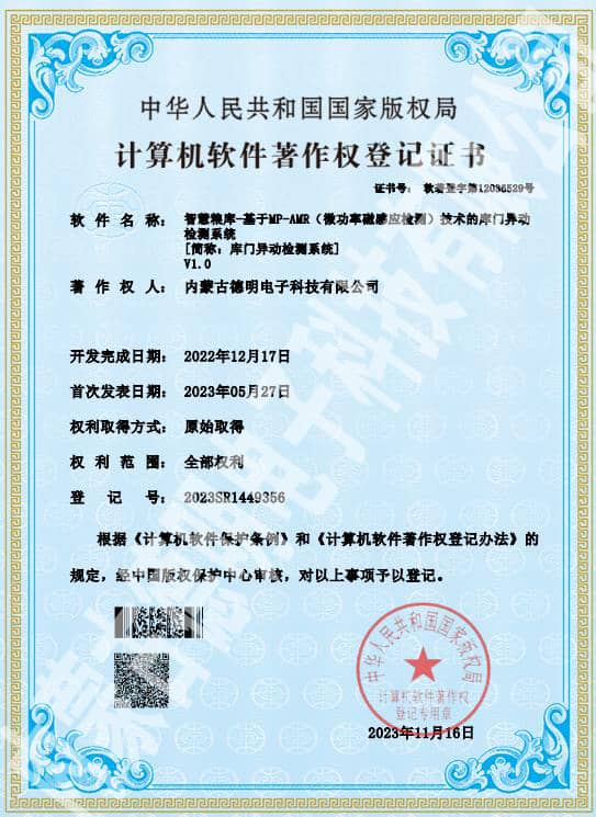 2023年11月16日,我司取得‘’智慧粮库-基于MP-AMR(微功率磁感应检测)技术的库门异动检测系统‘’计算机软件著作权登记证书。